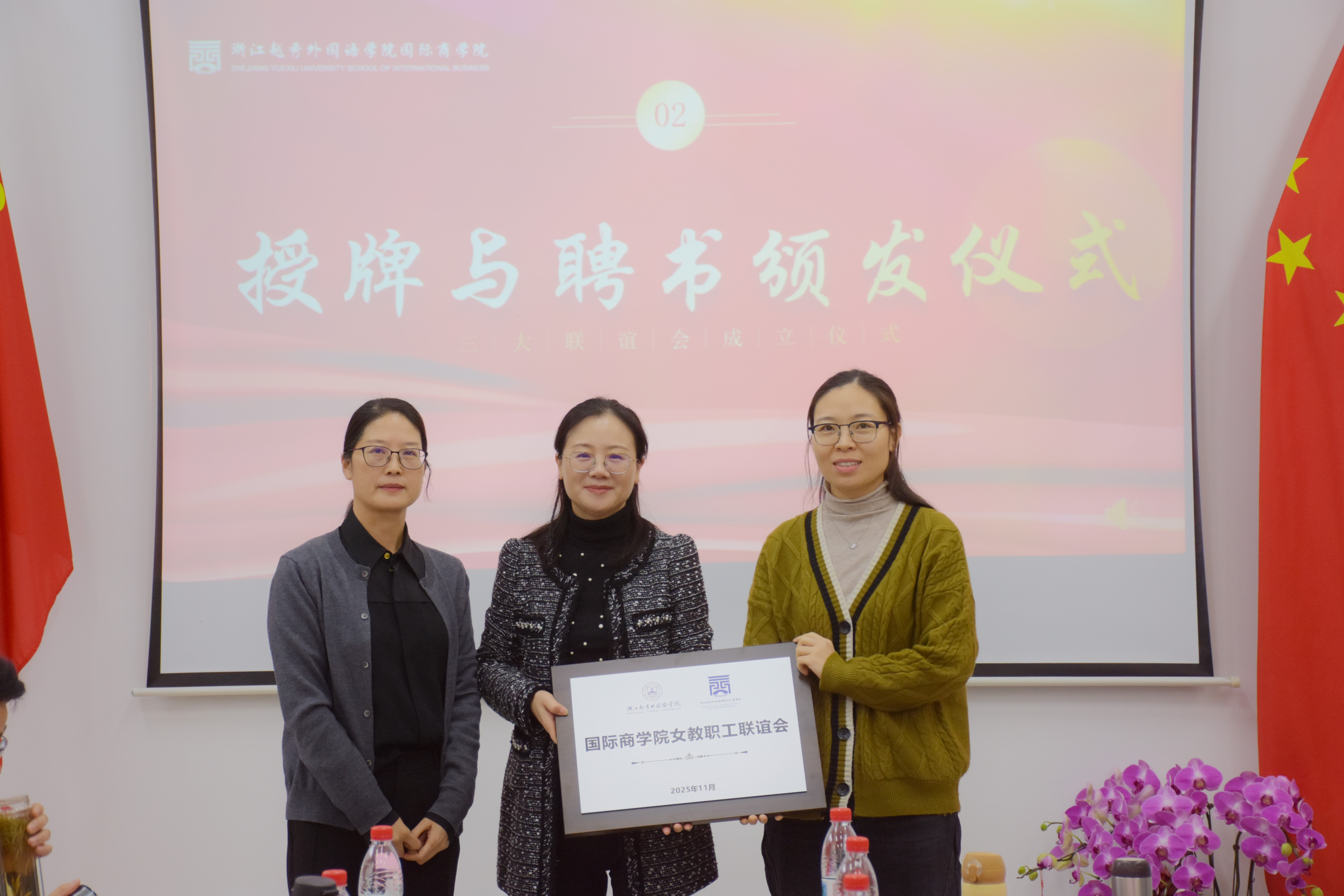 11 月 12 日上午 9:00,国际商学院教授、博士、女教职工联谊会成立仪式在学院 2-315 会议室隆重举行。学校工会主席杨钢、学校妇联主席兼酒店管理学院党委书记吴伟英、学校组织部副部长、人事处副处长郑红莲等相关部门领导莅临指导,学院院长李晓明教授、党委书记施文妹教授及全体副院长,三大联谊会会长、执行会长、教师代表和联谊会干事共同参会。仪式由学院党委副书记凌玮主持。