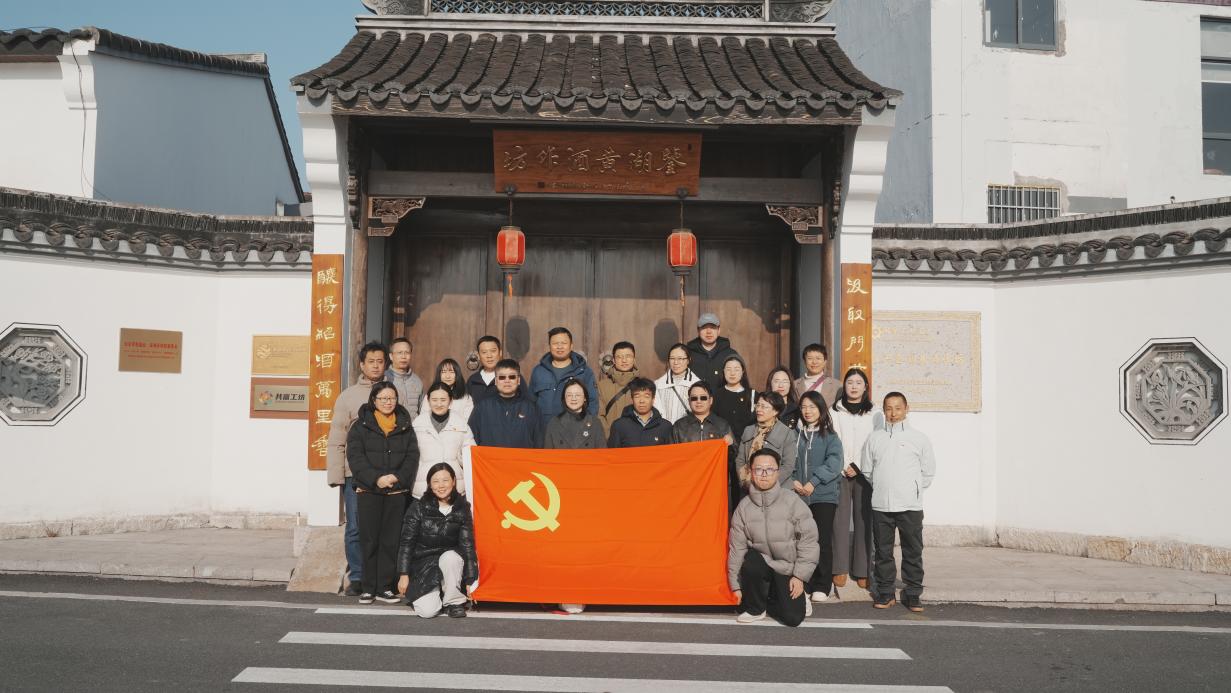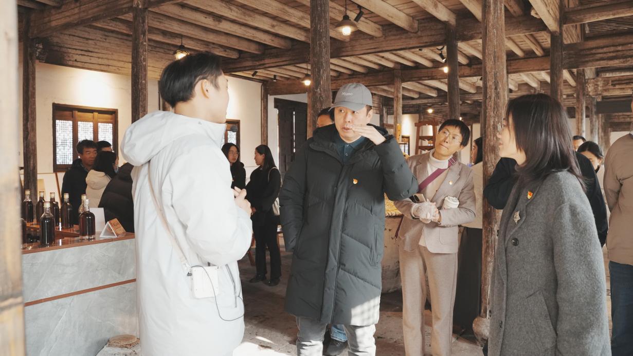 当日13:30,国际商学院的党员们首先参观了拥有300年历史的国家工业遗产—鉴湖酒坊。踏入酒坊,青石板路蜿蜒向前,古色古香的木质作坊错落有致,空气中弥漫着清甜的米香与酒香,瞬间让人静下心来。党员们先在非遗文化展示墙前驻足,聆听讲解员介绍酒坊的百年传承史与非遗保护成果,随后沿着生产动线,先后参观了原料预处理区、发酵区、蒸馏区等核心车间,222道古法酿造工序通过实物、展板与现场操作清晰呈现,体会到非遗传承人坚守古法、传承非遗文化的初心。