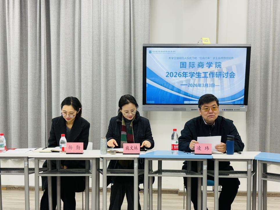 为进一步探索新时代商科院校学生工作新模式、新路径,持续提升 “红商青年” 学工品牌育人实效,3 月 3 日上午 9 时,国际商学院于 2-421 会议室召开了主题为 “大学工协同育人模式下的‘红商青年’学工品牌路径提升”的学生工作研讨会。学生处学工部(处)副部(处)长杨勤、国际商学院党委书记施文妹出席会议,学院全体辅导员参与研讨,会议由学院党委副书记凌玮主持。